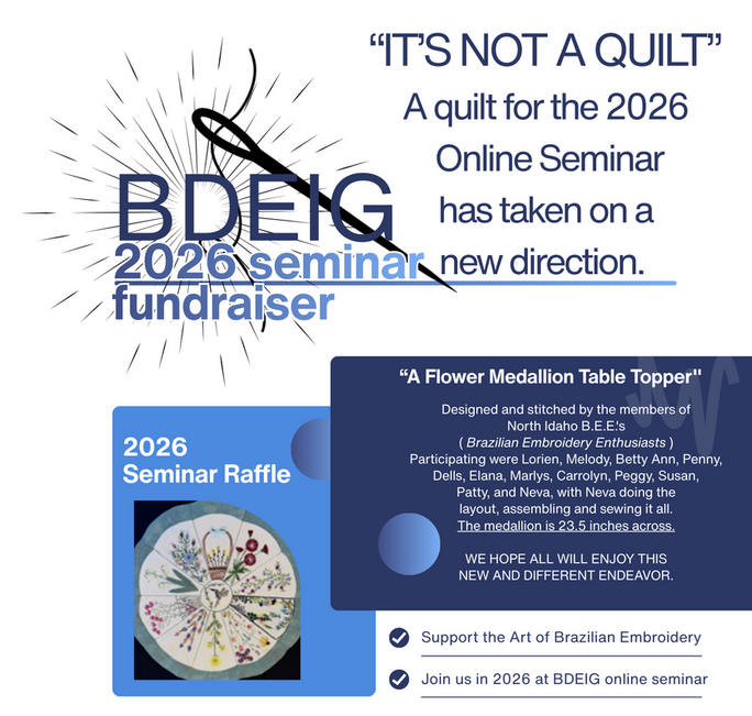 Membership to BDEIG is open to all stitchers, amateur and professional, novice and experienced. The only criteria for membership are a love of Brazilian embroidery and the desire to learn more about this needle art.